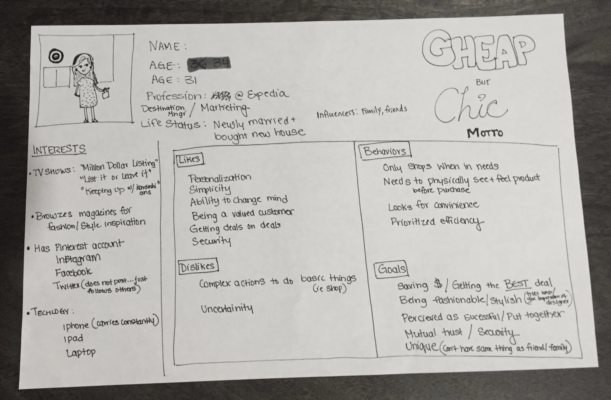Rachel is a newly-wed that is excited to start decorating her new home but knows she is on a budget. Her LIKES, DISLIKES, BEHAVIORS, and GOALS in relation to decor and shopping were taken into consideration for every part of the design process.